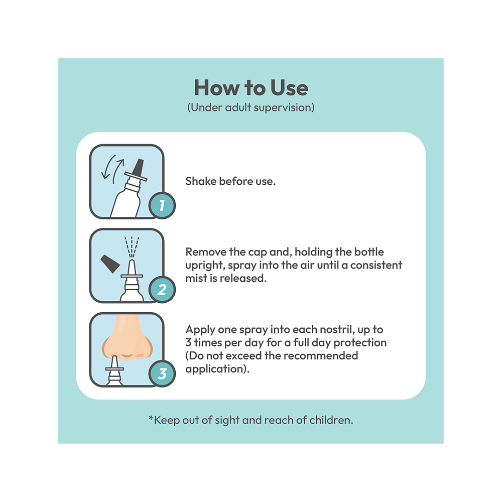 APPLICATIONS: Suitable for adults and children over 12 years. Apply 2-3 sprays per nostril and 4x per day maximum. The carefully balanced spray stays in the nose for at least 6 hours per application (Research Article: Advanced Materials, 2021, 33, 2008304).